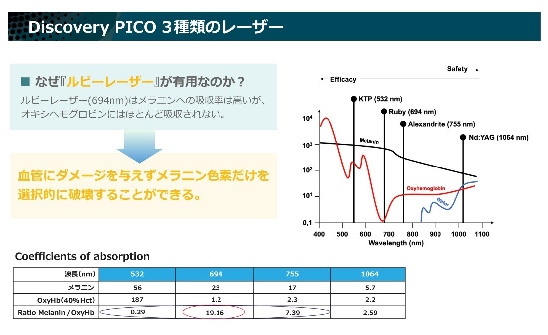 IPLの場合は、メラニン色素以外にも血管(ヘモグロビン)に対する反応がしっかりあるため、赤ら顔や酒さに対しても有効です。いっぽう、ルビーフラクショナルレーザーではメラニン選択性が非常に高い一方で、ヘモグロビンに対して反応はありません。赤みには効かないけれども色素性病変に対してはIPL以上にしっかり効果があります。
